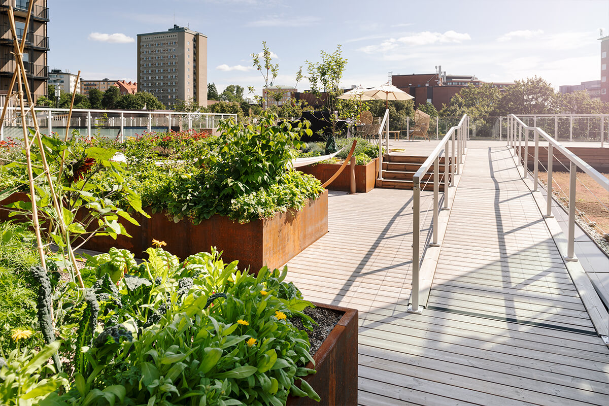 På taket av Electrolux Groups huvudkontor på Kungsholmen i Stockholm har medarbetare och boende fått tillgång till en helt ny grön utemiljö. Takterrassen erbjuder trall- och plattsättning i flera nivåer, utomhuskök och gym, en boulebana och planteringslådor där boende kan odla sina egna grödor.