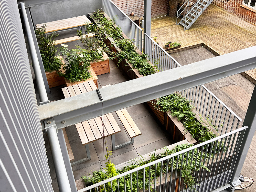Förvandlingen stannar inte vid takterrassen. Även svalgångarna är inkluderade i projektet, där planteringslådor kombinerade med vajersystem skapar gröna förbindelser mellan våningarna och ger de boende extra utrymme för samvaro. Här har GreenWall dragits upp längs planteringslådorna, förts till våningen ovanför och tillbaka igen – ännu ett exempel på hur systemet kan anpassas och användas kreativt.